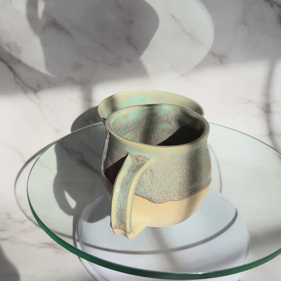 This charming cream and sugar set brings coastal vibes straight to your table. Hand-painted with ocean-inspired glazes that dance across creamy white clay, each piece is truly one of a kind. Watch the beautiful colors swirl and blend—no two sets are exactly alike. Perfect for adding a splash of seaside whimsy to your morning coffee ritual or special gatherings. A delightful way to serve with personality and flair.