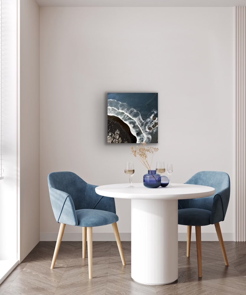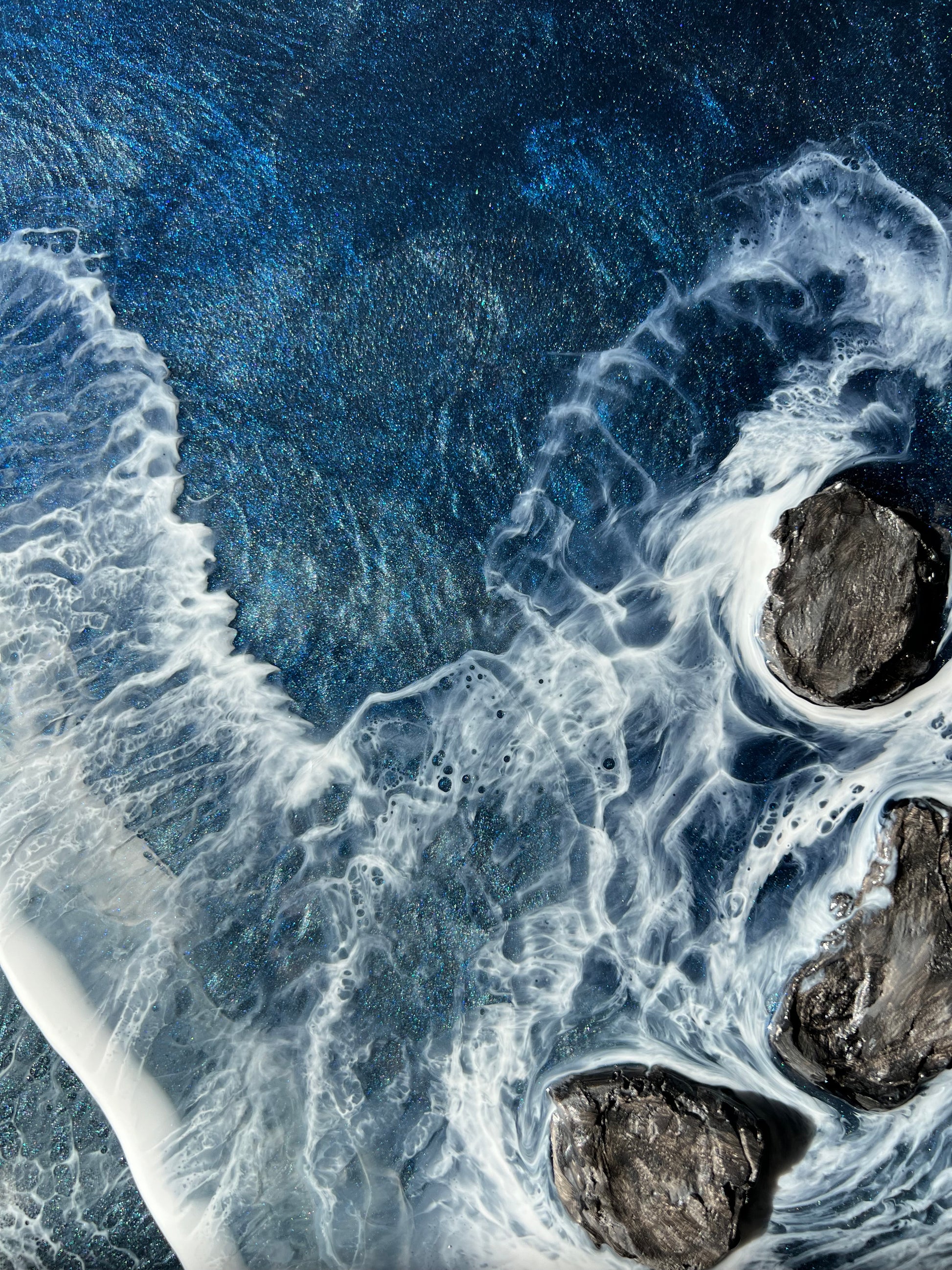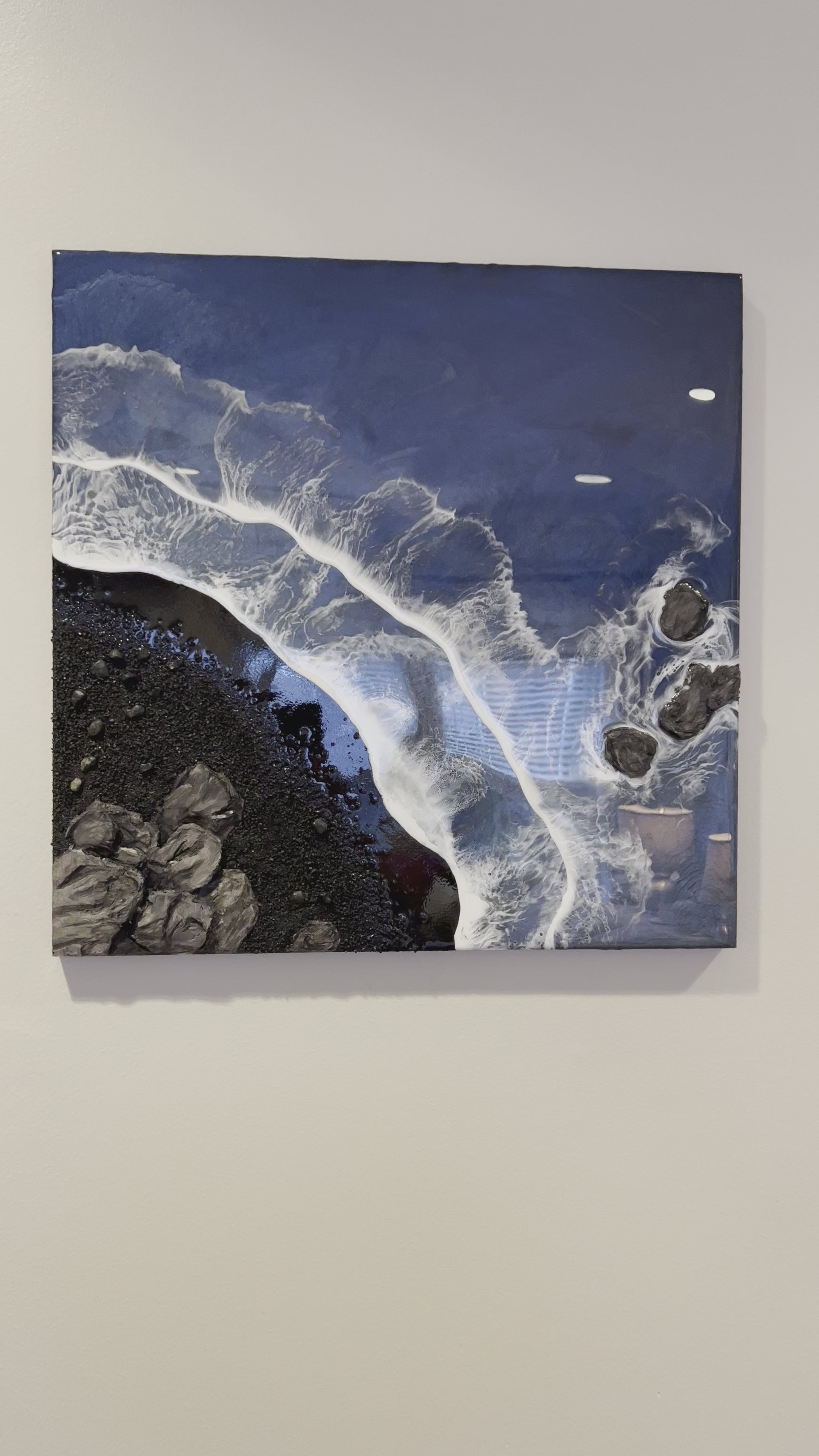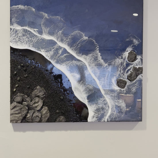 Discover a world of beauty in Deep Calls to Deep, a 20x20" captivating painting with mesmerizing ocean blues and contrasting dark sands and rocks. Expect a dreamy nightscape, a perfect reminder of the mystery and splendor of the ocean.