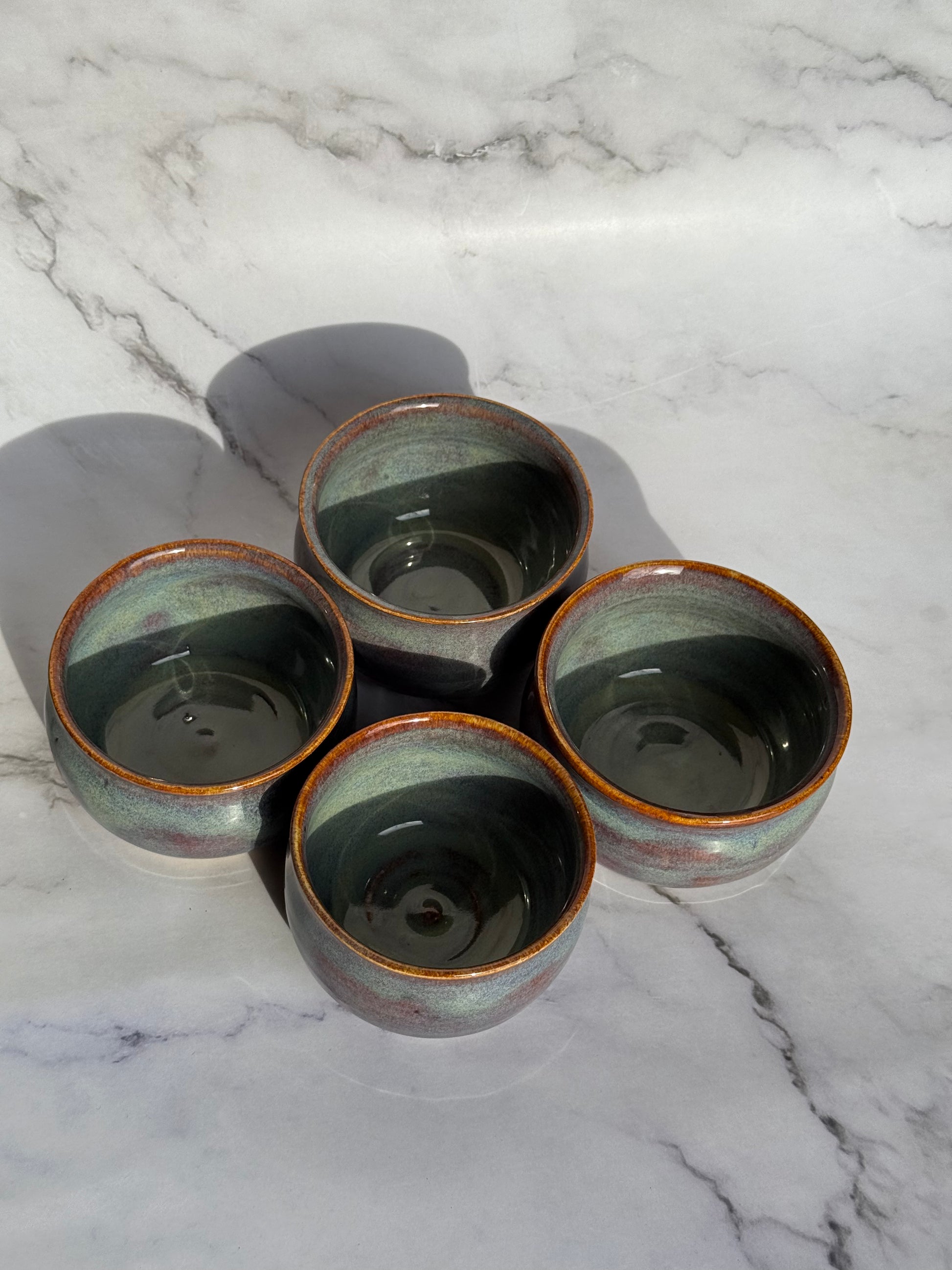Elevate your dessert game with this charming set of four handcrafted bowls! Each piece is a one-of-a-kind creation, featuring creamy white clay kissed with warm bronze accents and a gorgeous blue glaze that catches the light beautifully. Perfect for serving up sweet treats, these artisan bowls bring personality and warmth to your table. Whether you're hosting a dinner party or treating yourself to something special, these unique pieces are sure to spark joy and conversation. A delightful addition to any kitchen!