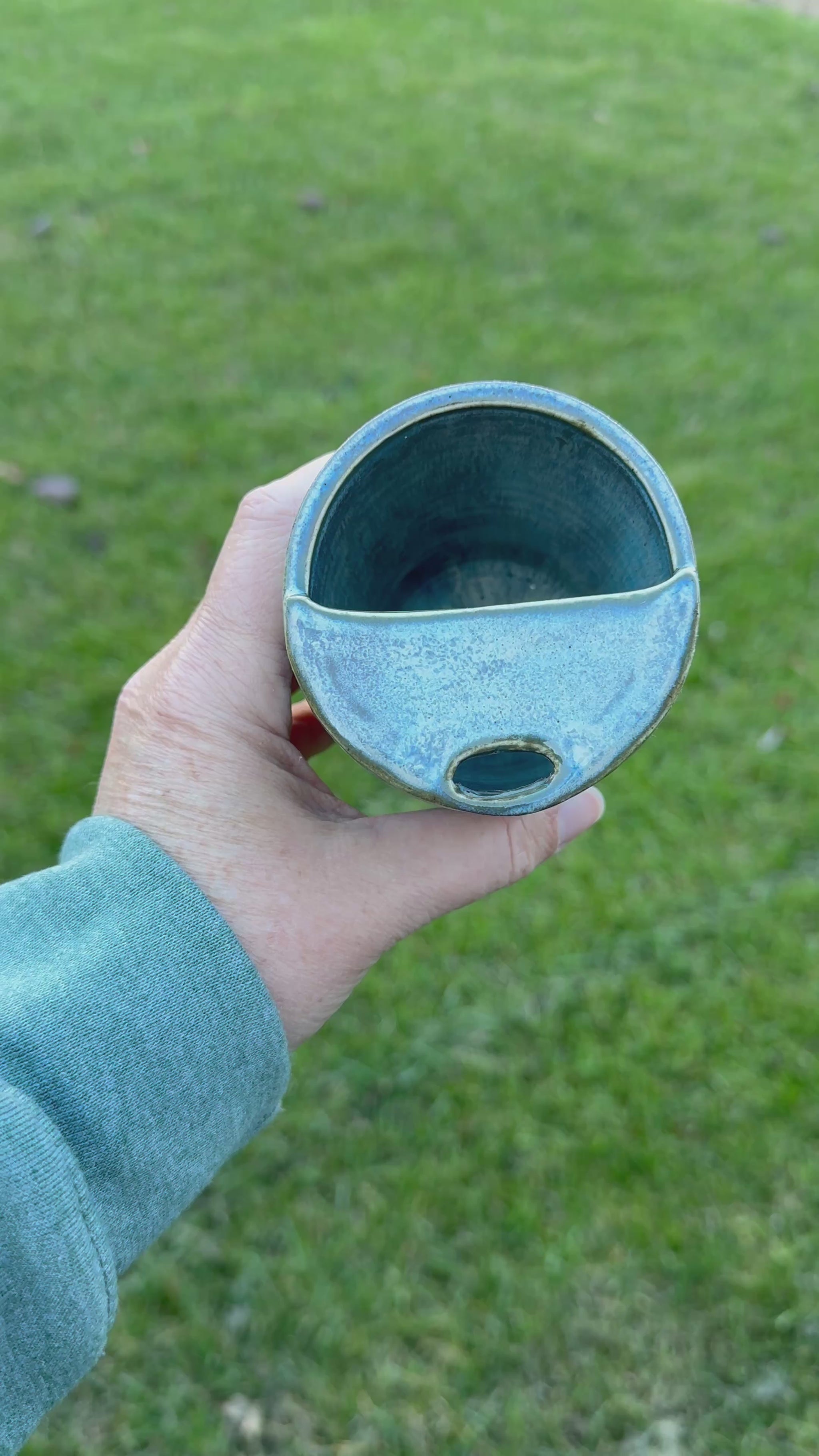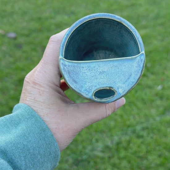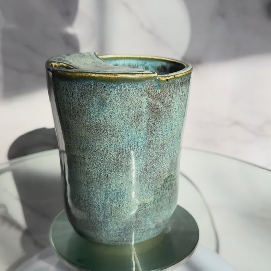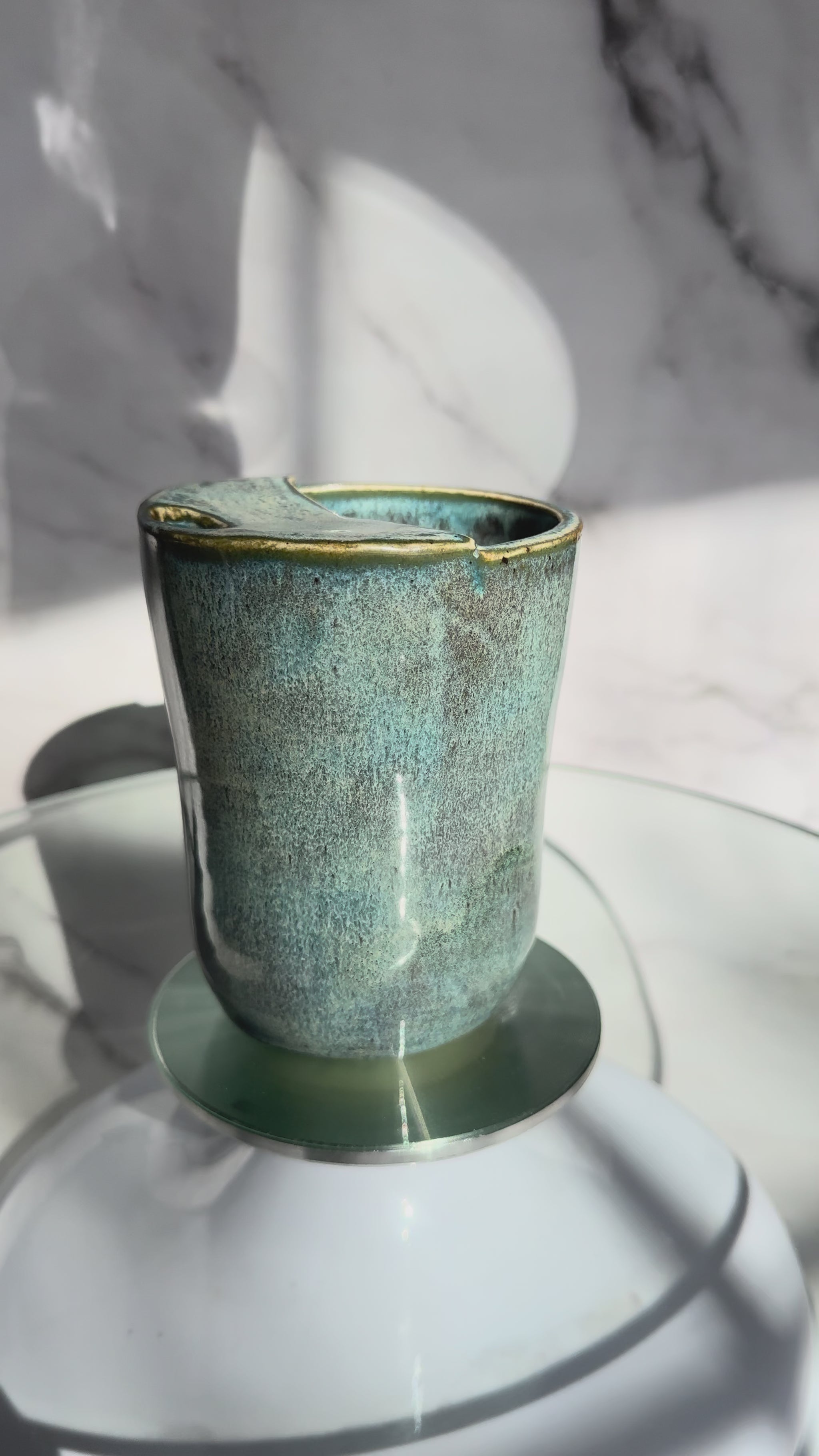 Sip with intention in this handmade ceramic tumbler that's totally one-of-a-kind! Crafted from smooth white clay and glazed in a mesmerizing blue with beautiful flowing movement, it's as much a conversation starter as it is your morning companion. Flip it over and discover Romans 8:28 nestled on the bottom—a little spiritual pick-me-up with every cup. Because your coffee deserves to be as thoughtful as you are.